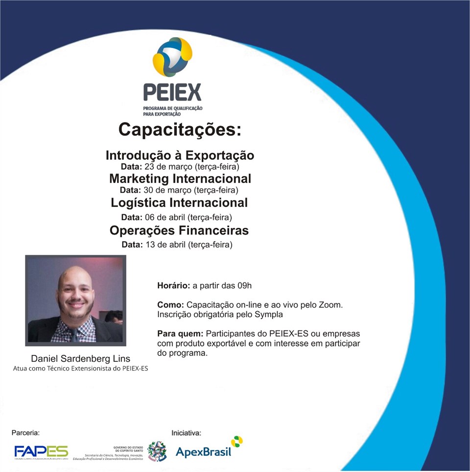 As capacitações, ministradas pelo extensionista Daniel Sardenberg Lins, são direcionadas às empresas inscritas no programa, no entanto, estas serão abertas às empresas que tenham interesse em conhecer o PEIEX-ES e se aprofundar nos temas que envolvem a internacionalização. Para participar, é fundamental que as empresas realizem as inscrições pelo sistema Sympla, no link a seguir: https://bit.ly/3bVWgMi.